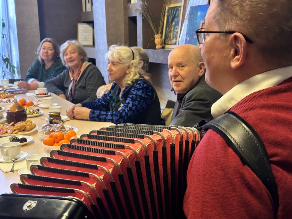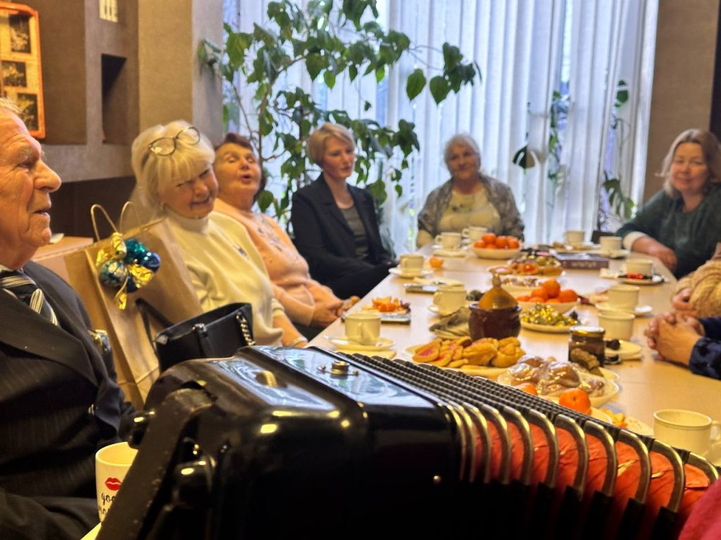 Вечер продолжился за чашкой чая, под звуки баяна и песни военных лет. Музыка создала атмосферу уюта и ностальгии, позволив участникам вновь окунуться в воспоминания о молодости и о том времени, когда музыка объединяла людей. Песни, знакомые каждому, вызвали улыбки, напомнив о том, что несмотря на трудности, всегда есть место для надежды и любви.
